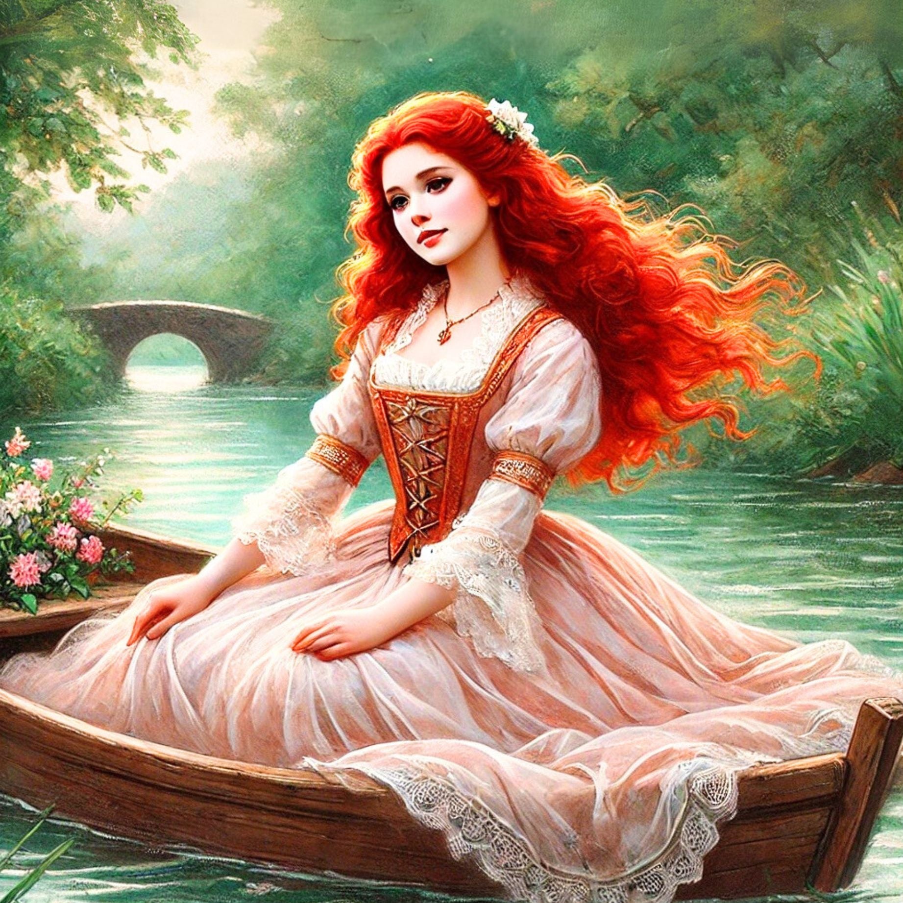 Sail into a world of dreams and imagination with this premium square laser lomo card, capturing Anne Shirley in one of her most whimsical adventures—dressed as the Lady of Shalott, floating in her little boat upon the Avonlea pond.