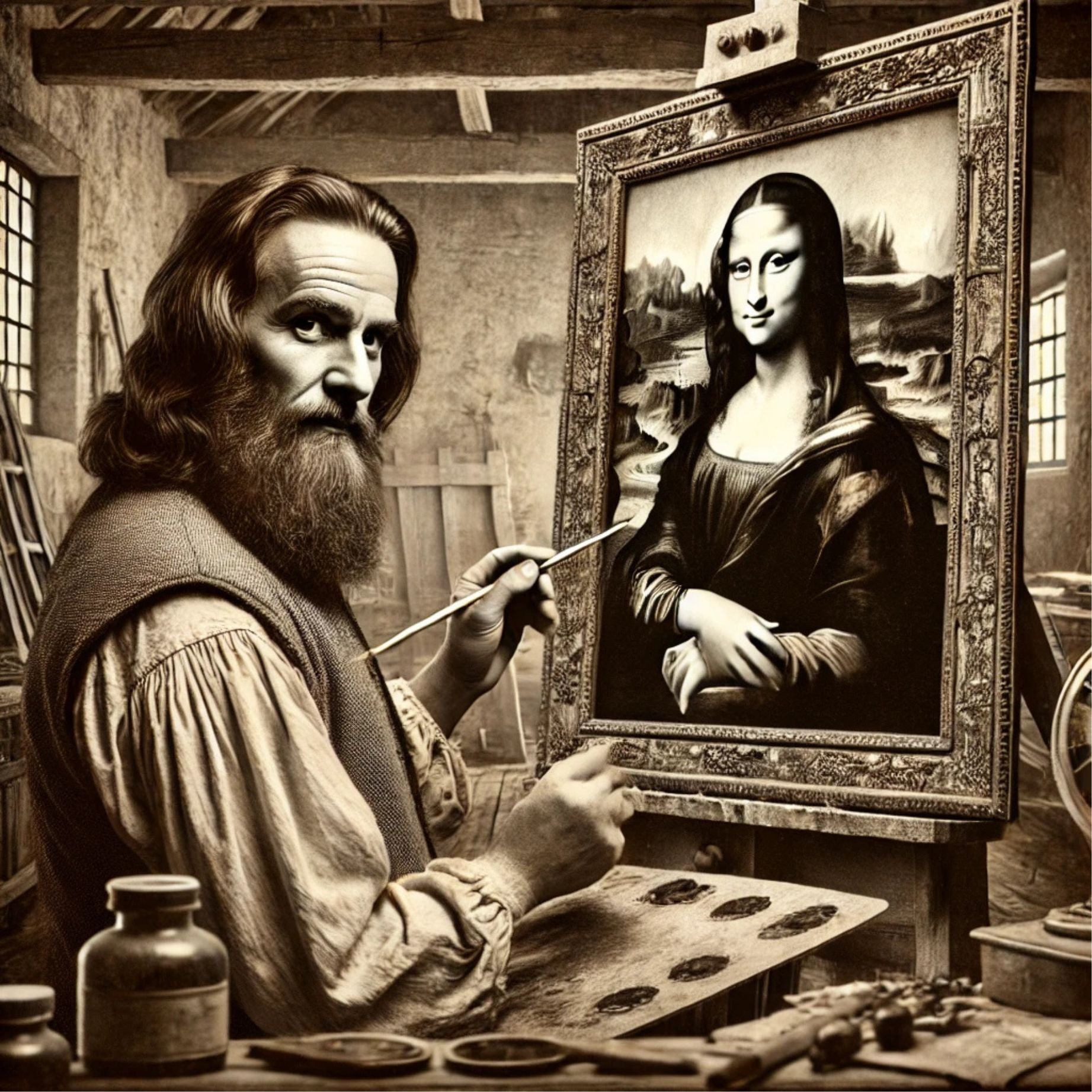 Step into the heart of the Renaissance and witness genius at work with this premium square laser lomo card, capturing Leonardo da Vinci in the midst of painting his legendary Mona Lisa.